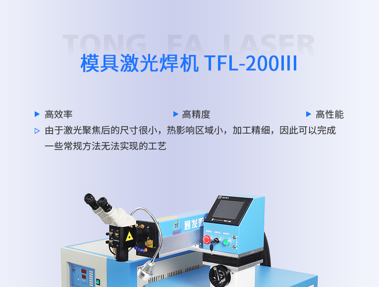 通發(fā)激光國內(nèi)率先推廣國產(chǎn)模具激光焊機,TFL-200Ⅲ升級型世界500強選用,針對精密塑膠模具激光焊、鏡面塑膠模具激光燒焊、精密壓鑄模具激光焊補.為國內(nèi)模具修復(fù)行業(yè)做出巨大貢獻。