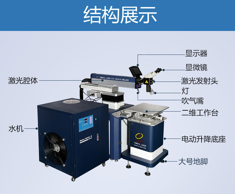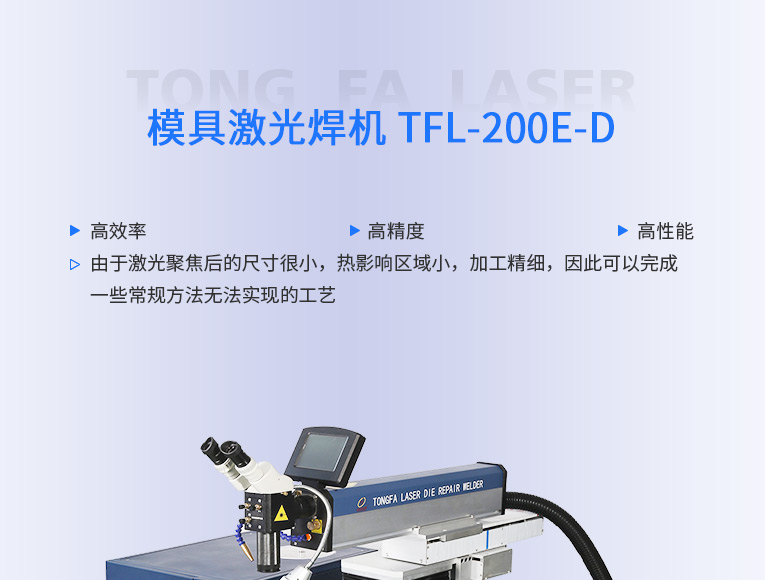 出口型模具激光焊機是通發(fā)激光公司專門為出口國外客戶使用而設(shè)計的系列機型TFL-200E-D,配置激光頭電動升降,同時配置操縱桿無極調(diào)速控制XY橫向和縱向電動移動。適用于各類精密注塑模具、壓鑄模具等模具激光修補焊接;同時也適合鑄件沙孔激光修補、模具崩缺激光修復(fù)、過切加工等的激光修補;各類金屬結(jié)構(gòu)件、金銀首飾的激光焊接加工。